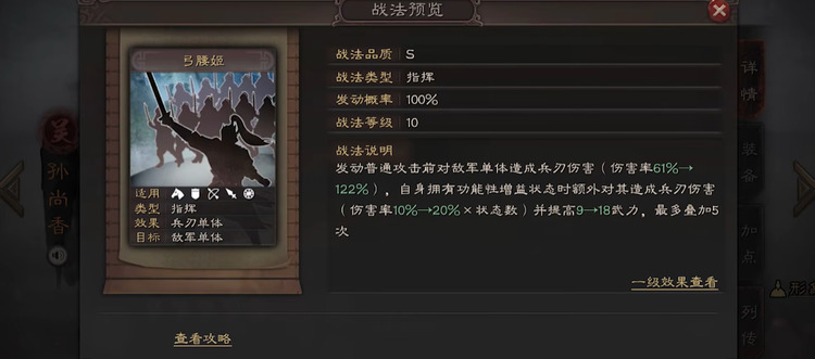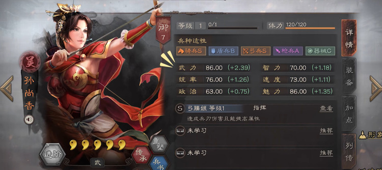 三国志战略版孙尚香强度如何?孙尚香是S2的核心牌,由S3凌统和PK赛季周泰组成的吴骑是PK赛季常青树的组合。但在S2和S3赛季,孙尚香的实用性相对较窄,但作为一名军事教师,她是土地复垦期不可缺少的一部分。孙尚香的军事教师技能是动员技能,除铜矿外,立即获得基本产量50小时,受熟练程度的影响,最多可获得100小时的产量。产量会增加,但每天只能使用两次,每次使用提高6%的熟练程度,消耗12点的策略和策略点。